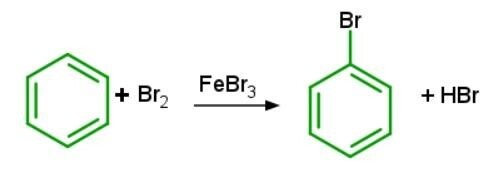 與碘 (I)、氯 (Cl) 或溴 (Br) 的芳香鹵化反應可以產生芳基鹵化物或滷代芳烴。在這些過程中,三鹵化鋁通常用作催化劑。