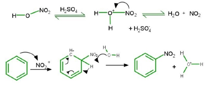 在這個過程中,也使用了硫酸作為催化劑。使用的另一種酸是硝酸,它最終會失去一個質子以產生硝鎓離子。親電芳香取代 (EAS) 過程可用於處理這種硝鎓離子。