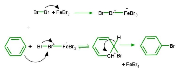 在這個過程中,苯環最終會失去其芳香性併產生活化能。由於它們的正電荷 (+ve),溴或氯利用它們的親電作用來應對這種能量。