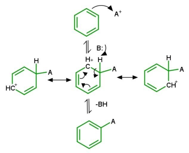 結果,產生了芳鎓離子,它是一個帶正電荷 (+) 的離域環己二烯基陽離子或共振穩定的碳正離子。
