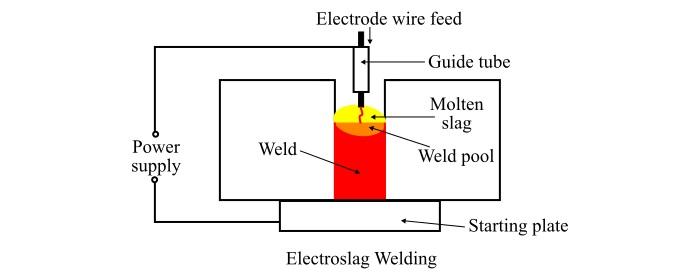 在電渣焊中,電弧最初由送入所需焊縫位置的焊絲引燃,然後加入焊劑。繼續新增焊劑,直到熔融焊渣到達電極頂端,使電弧熄滅。然後,焊絲透過可熔導向管連續送入金屬工件表面,並利用熔融焊渣的電阻來熔化填充金屬,從而實現熔合。