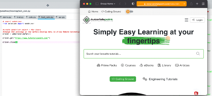 # import webdriver from selenium import webdriver # create webdriver object - Windows User driver = webdriver.Chrome() #create webdriver object - Mac Users #Change the settings in the Safari Develop menu to Allow Remote Automation driver = webdriver.Safari() driver.get("https://tutorialspoint.tw/") driver.close()
