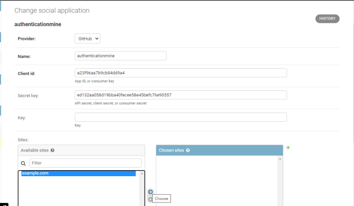 在 **站點** 部分,點選 **example.com**,然後點選箭頭鍵並點選儲存。這將在您的 Django 專案中註冊 **github** 作為身份驗證後端。