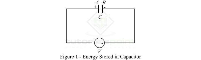 典型的電容器由兩個金屬板組成,這兩個金屬板之間隔著一層絕緣材料,稱為介電材料。當電容器的這兩個金屬板連線到電源時,電容器開始充電並在其介電材料中儲存電能。因此,推匯出電容器中這種儲存能量的表示式非常重要,這樣我們就可以選擇合適的電容器來進行電路設計。