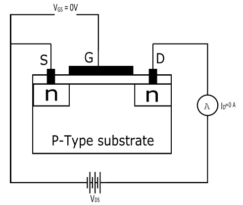當 VGS = 0 V 時,沒有連線源極和漏極的溝道。p 型襯底只有少量熱產生的自由電子(少數載流子),因此漏極電流為零。因此,EMOSFET 通常處於關閉狀態。
