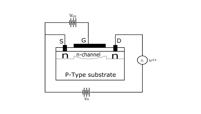 透過施加適當幅度和極性的柵源電壓 (VGS),可以使器件工作。VGS 的使用會在柵極端子下方感應出一個 n 型溝道,從而使器件工作。