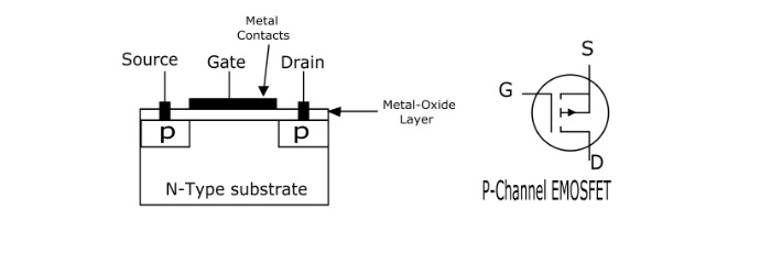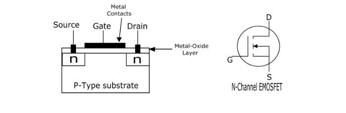 增強型金氧半導體場效應電晶體 (EMOSFET) 是一種三端器件,即源極 (S)、柵極 (G) 和漏極 (D)。EMOSFET 是一種電壓控制型器件。