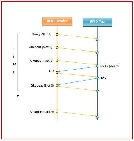 在時隙 0,讀取器廣播查詢訊息以啟動該過程。然後,它在每個後續時隙傳送 QRepeat 訊息。接收到 QRepeat 訊息後,標籤會隨機選擇一個時隙傳送其訊息。首先,它在 RN16 訊息中傳送一個簡短的 16 位數字。如果沒有發生衝突,讀取器會發送確認 (ACK) 訊息。然後,標籤獲取下一個時隙併發送其 EPC 識別符號。
