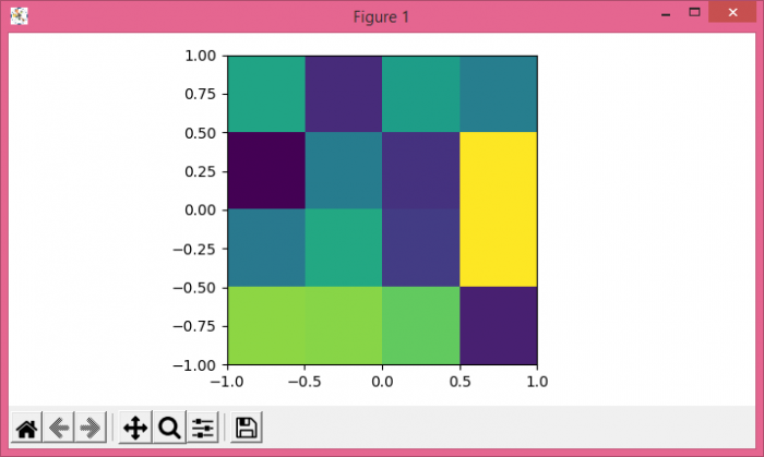 import numpy as np from matplotlib import pyplot as plt plt.rcParams["figure.figsize"] = [7.00, 3.50] plt.rcParams["figure.autolayout"] = True data = np.random.rand(4, 4) plt.imshow(data, extent=[-1, 1, -1, 1]) plt.show()
