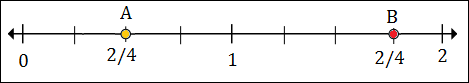 要繪製 1$\frac{2}{4}$,我們在 1 和 2 之間放置一個點,位於 1 右側 2 個刻度。
