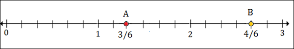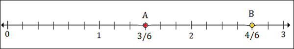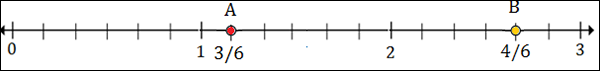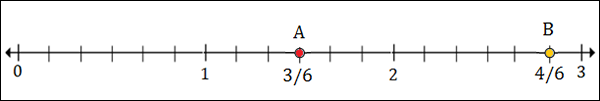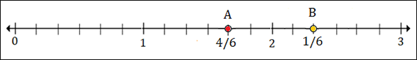 要繪製 2$\frac{4}{6}$,我們在 2 和 3 之間放置一個點,位於 2 右側 4 個刻度。