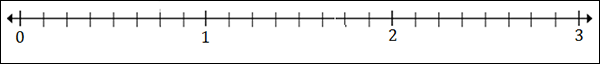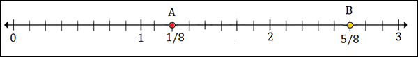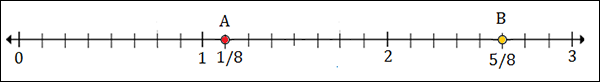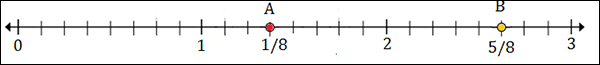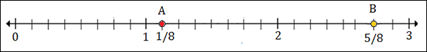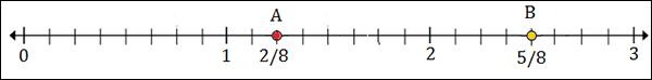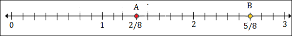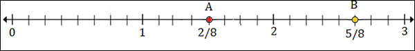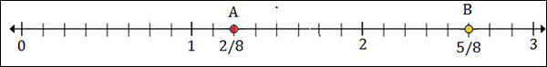 要繪製 2$\frac{5}{8}$,我們在 2 和 3 之間放置一個點,位於 2 右側 5 個刻度。