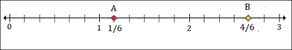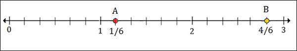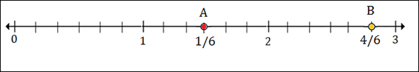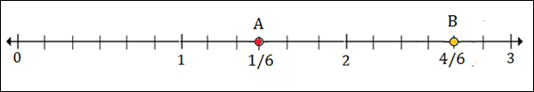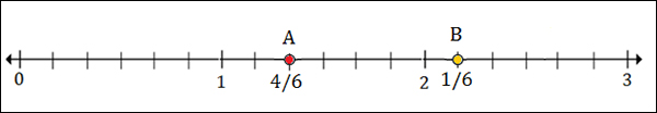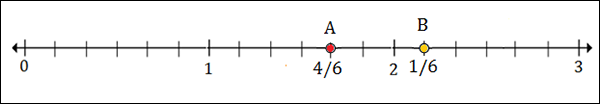 要繪製 2$\frac{1}{6}$,我們在 2 和 3 之間放置一個點,位於 2 右側 1 個刻度。