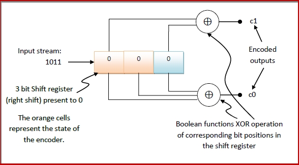 為了生成卷積碼,資訊按順序透過線性有限狀態移位暫存器。移位暫存器包含 (-bit) 階段和布林函式發生器。