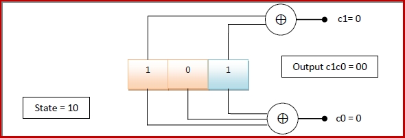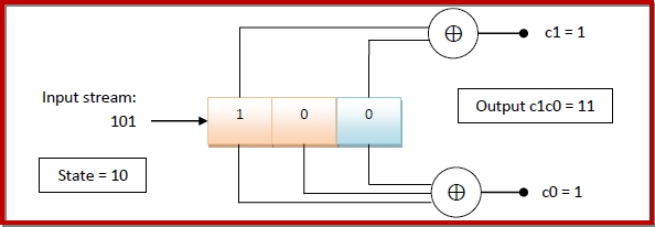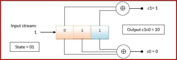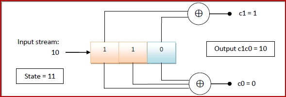 讓我們考慮一個k = 1, n = 2 和 K = 3 的卷積編碼器。