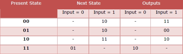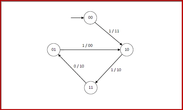 The set of states = { 00, 01, 10, 11}我們可以看到,在初始狀態 00 中,當輸入 1 時,下一個狀態變為 10,相應的輸出為 11。在此狀態 10 中,當輸入 1 時,下一個狀態為 11,編碼器輸出為 10。以同樣的方式,我們得到其他轉換。當將其製成表格時,我們得到如下狀態轉換表 -
