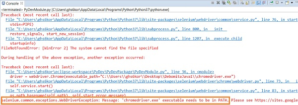 如果 in webdriver.Chrome() 中可執行檔案 chromedriver.exe 的路徑未正確實設定或不正確,則我們可能會得到錯誤 selenium.common.exceptions.WebDriverException。下圖顯示了這樣的異常。