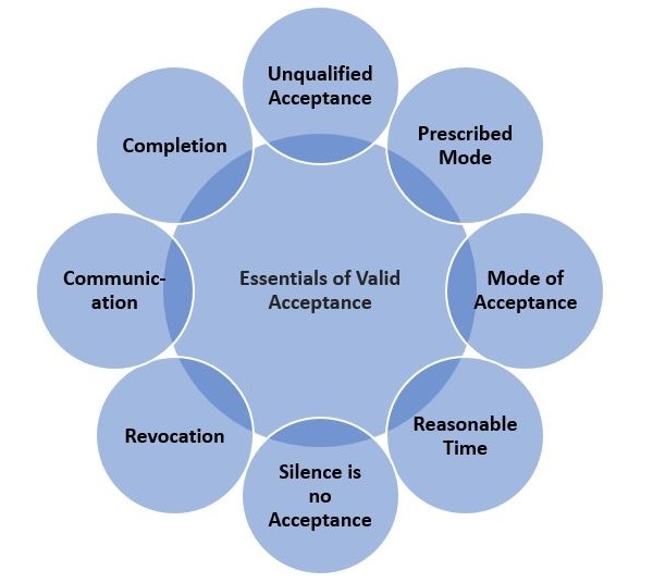 接受是合同形成和完成的最關鍵階段,因為它標誌著受諾人和承諾人同時開始具有法律效力的權利、義務和責任。此外,雖然受要約人沒有義務接受要約,但一旦他接受,他就受其約束,一旦要約人知悉該接受,他也受其約束。因此,僅僅是精神上的接受並不構成法律關係;而是以標準的溝通方式表達它才導致合同的成立。