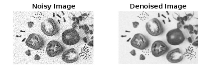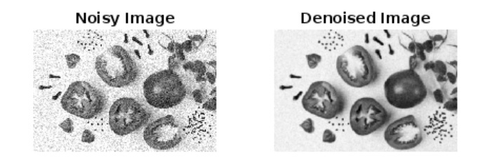 ', std_dev); % Denoise the image using the gaussian filter denoised_img = imgaussfilt(gray_img, 1.5); % Display the noisy and denoised images figure; subplot(1, 2, 1); imshow(noisy_img); title('Noisy Image'); subplot(1, 2, 2); imshow(denoised_img, []); title('Denoised Image');