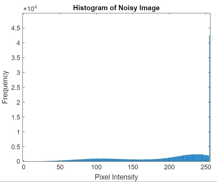 % MATLAB code to estimate gaussian noise using histogram analysis % Read the noisy image noisy_img = imread('noisy_image.jpg'); % Convert to the noisy image to grayscale gray_img = rgb2gray(noisy_img); % Compute the histogram of the noisy image [counts, binLocations] = imhist(gray_img); % Display the histogram of noisy image figure; bar(binLocations, counts); title('Histogram of Noisy Image'); xlabel('Pixel Intensity'); ylabel('Frequency'); % Fit gaussian distribution to pixel intensity values g = fitdist(gray_img(:), 'Normal'); % Estimate the mean value and standard deviation mean_value = g.mu; std_dev = g.sigma; % Display estimated gaussian noise parameters fprintf('Estimated Mean Value: %.2f