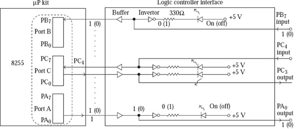 PQRS輸入分別連線到8255的PB3、PB2、PB1和PB0。X和Y的輸出端分別連線到PA1和PA0。程式埠C應僅用於輸出,並連線到輸入PB3-0的線路PC3-0。每當我們按下按鍵時,我們只需將埠C中的值遞減1。這導致埠B遞增,而不是每次按下按鍵都遞增。邏輯控制器的介面為使用者提供12個輸出線緩衝區和12個輸入線緩衝區。12個輸出線連線到ALS套件上8255的A埠和C埠(下)。8255的每條輸出線的輸出狀態都透過發光二極體(LED)顯示。在下圖中,連線用於僅製作8255的一條輸出線,如下所示。
