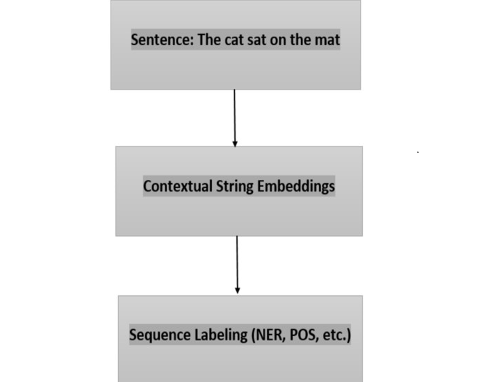 在FLAIR中,上下文字串嵌入模型(通常基於BERT或RoBERTa等轉換器架構)一次處理整個句子。它考慮句子中每個單詞的上下文,併為該單詞生成密集向量表示或嵌入。