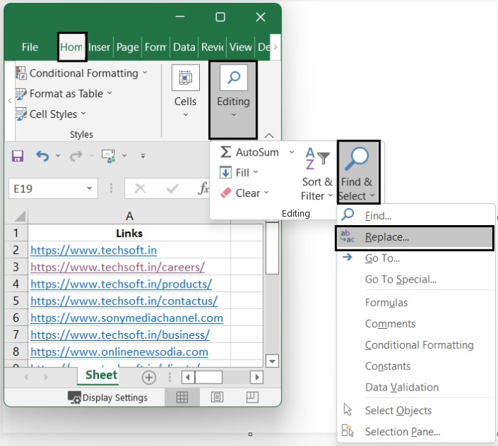 然後按Ctrl+H開啟查詢和替換對話方塊。或者轉到“開始”,然後從“編輯”功能區中,單擊查詢和選擇選項,從下拉列表中選擇替換選項,然後將開啟查詢和替換彈出視窗。