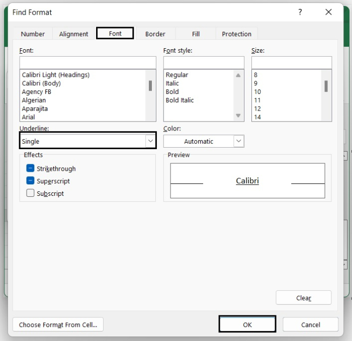 然後,選擇字型選項卡。在其中,從下劃線部分的下拉列表中選擇單下劃線。然後單擊確定。