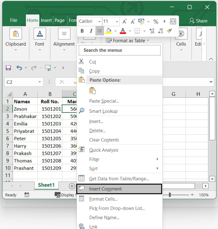 要向單元格添加註釋,請選擇要添加註釋的單元格,右鍵單擊該單元格,然後向下滾動列表,直到看到插入註釋選項。請參見下圖。
