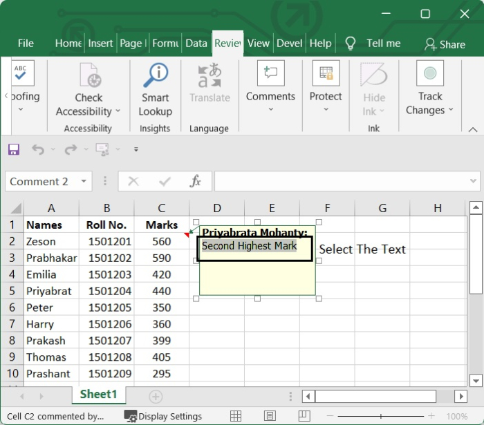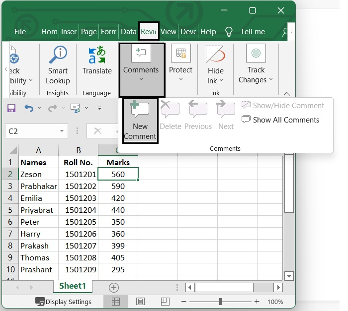 或者,您可以使用另一種方法,即轉到審閱選項卡。然後,在“註釋”功能區中,單擊新建註釋選項。請參見下圖。