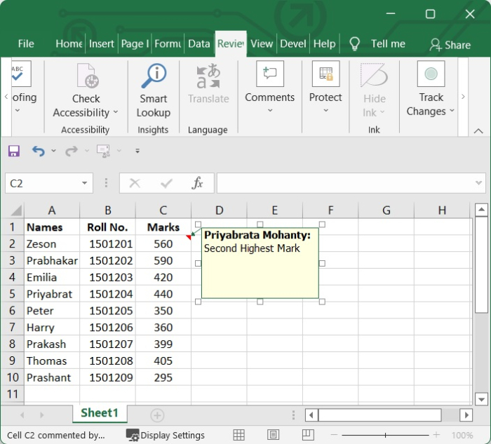 預設情況下,Excel 會隱藏註釋。您可以透過將滑鼠指標移到包含註釋的單元格上來檢視單個註釋。如果您想隱藏或顯示每個單元格中的註釋,請按照以下步驟操作。