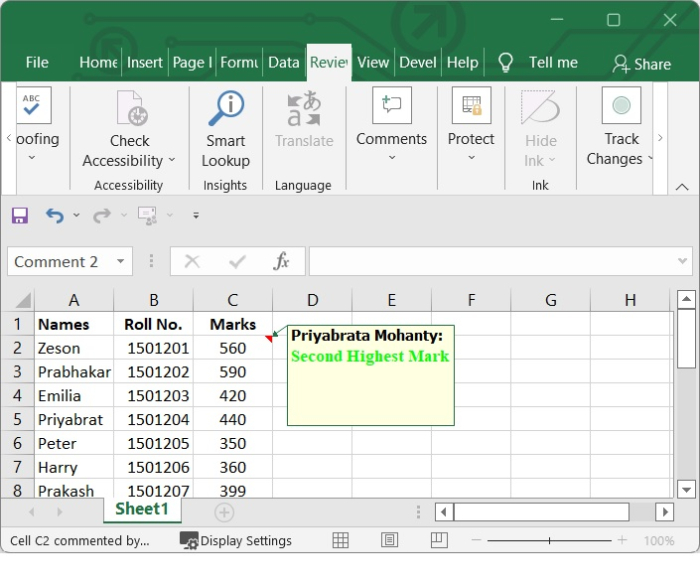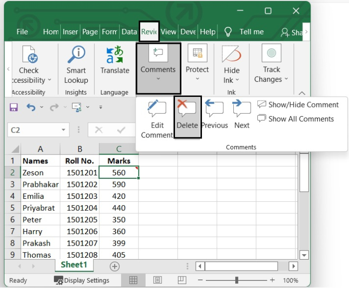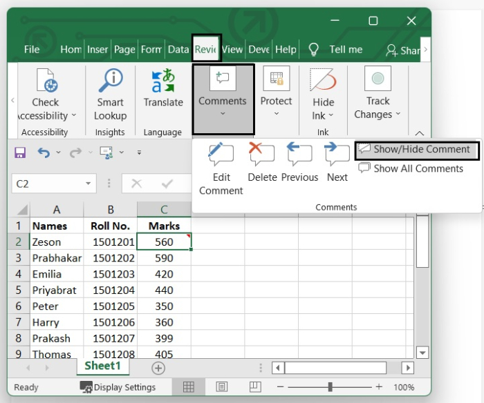 從“審閱”選項卡 - 轉到“審閱”選項卡。然後,在“註釋”功能區中,如果要檢視註釋,請單擊顯示/隱藏註釋選項,或者如果要隱藏註釋,請執行相同的操作。請參見下圖。