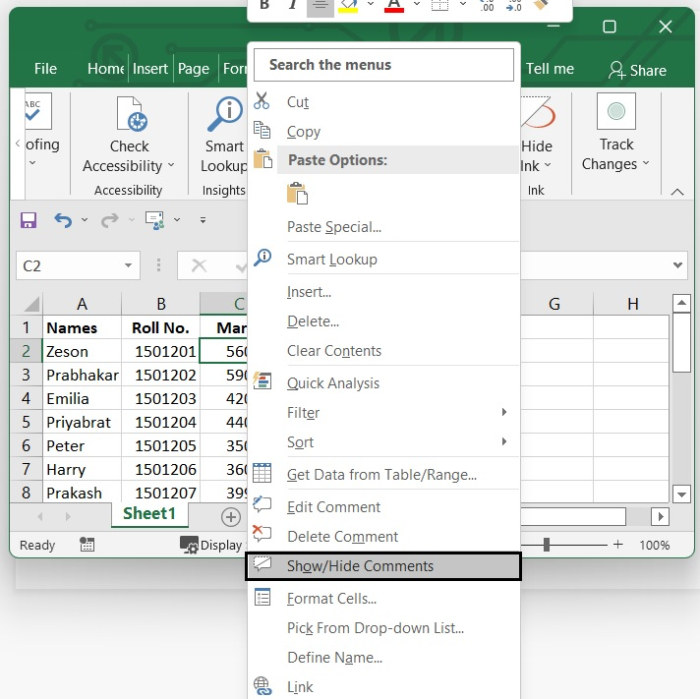 透過右鍵單擊單元格 - 另一種用於顯示或隱藏註釋的方法是,選擇添加了註釋的單元格,右鍵單擊該單元格,然後從選項中選擇顯示/隱藏註釋。
