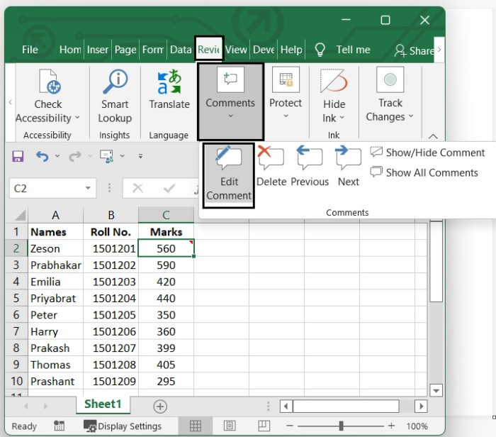 從“審閱”選項卡編輯註釋 - 選擇要編輯其註釋的單元格。轉到審閱選項卡。然後,在“註釋”功能區中,單擊編輯註釋選項。編輯完註釋後,單擊單元格外部以關閉文字框。請參見下圖。