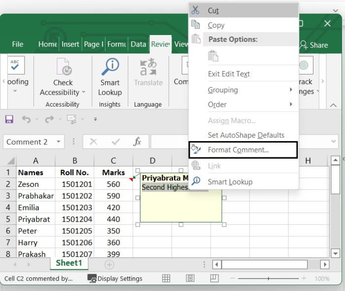 透過右鍵單擊單元格編輯註釋 - 選擇要編輯其註釋的單元格。右鍵單擊該單元格,然後從選項中選擇編輯註釋。請參見下圖。