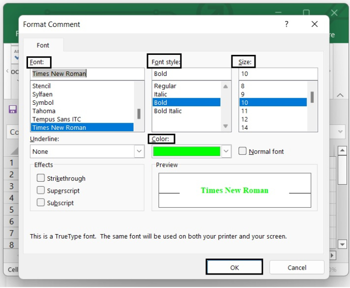 Excel 還可以根據使用者喜歡的樣式格式化註釋。註釋中使用的字型是 Tahoma,文字大小設定為 9。要更改字型的樣式、大小、顏色和效果,請按照以下步驟操作。