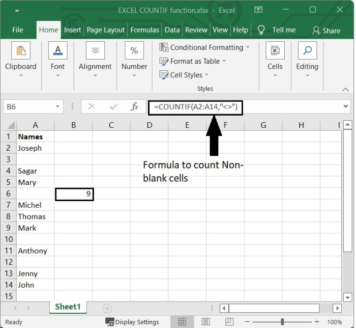 它將選擇從 A2 到 A14 的範圍,並計算非空單元格的數量。在上面的公式中,“<>”表示“不等於”,後跟“空”。COUNTIF 函式計算有多少個單元格不等於“空”。換句話說,就是單元格中沒有任何內容的單元格。