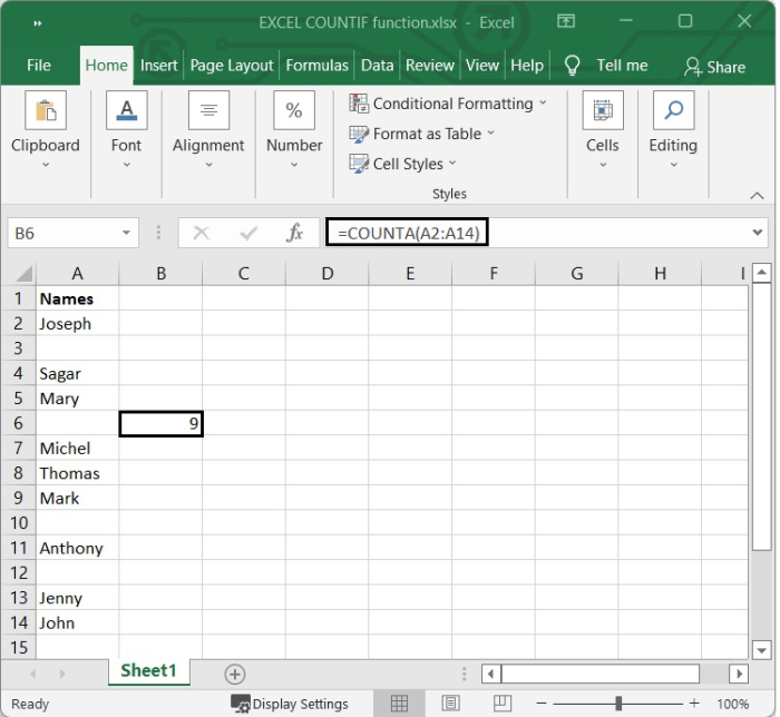 在我們的示例中,Excel 表格中有一些姓名和一些空單元格。讓我們計算一下示例中非空單元格的數量。