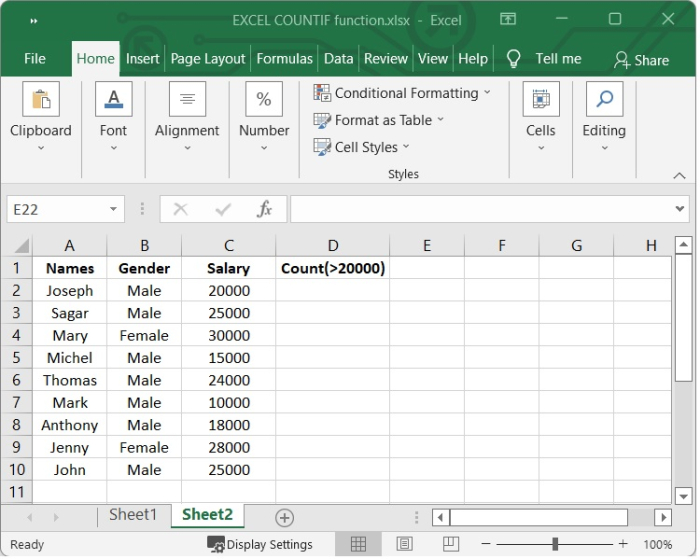 在我們的示例中,我們有員工姓名及其薪水。我們想要計算薪水大於 20,000 的員工人數。請參見下圖。