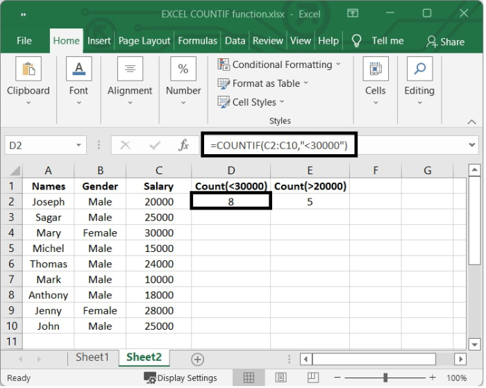 我們選擇了單元格 D2 並向其中添加了以下公式。按 Enter 鍵後,我們可以得到薪水小於 30,000 的員工人數。