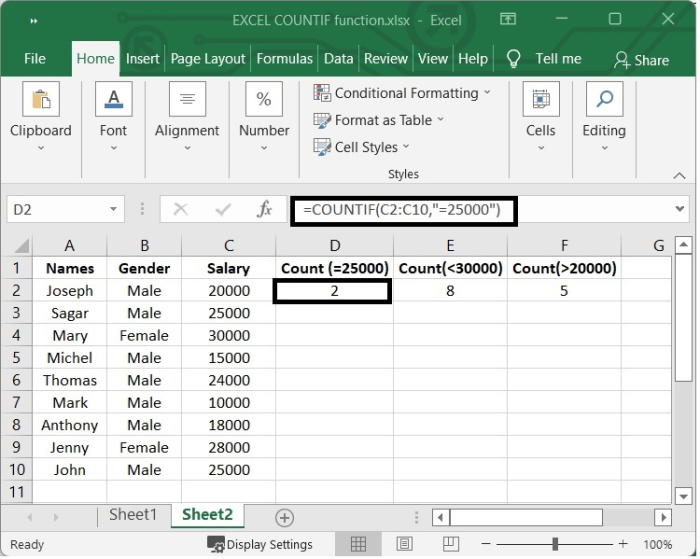我們選擇了單元格 D2 並向其中添加了以下公式。按 Enter 鍵後,我們可以得到薪水等於 25,000 的員工人數。