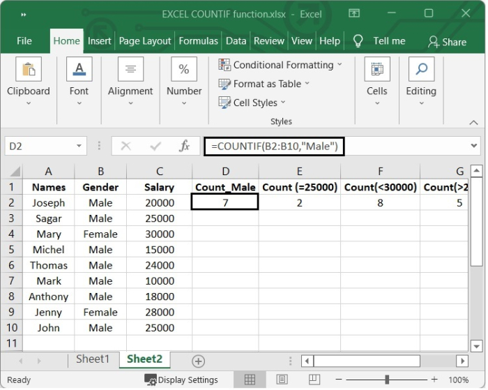 在上面的示例中,假設我們想要計算“男性”員工的人數。我們將使用以下公式進行計數。