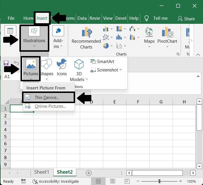 在插入選項卡的插圖部分下選擇圖片選項,然後單擊此裝置…選項。