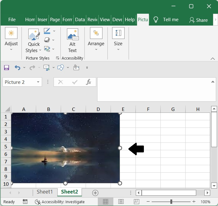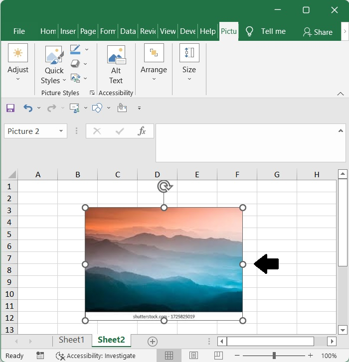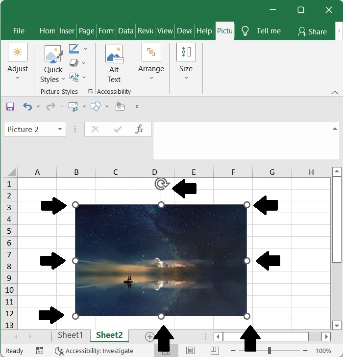 如果要更改圖片的大小,首先需要選擇它,然後查詢圖片邊框上的點,選擇並按住其中一個點,然後拖動它。