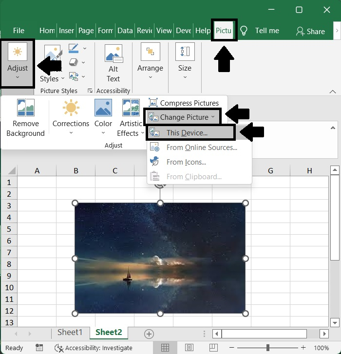 選擇圖片格式選項卡後,在調整部分中選擇更改圖片,然後在此下拉列表中選擇此裝置。