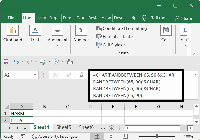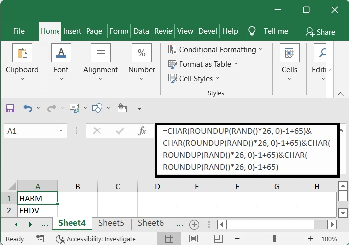 =CHAR(ROUNDUP(RAND()*26, 0)-1+65)&CHAR(ROUNDUP(RAND()*26, 0)-1+65)&CHAR(ROUNDUP(RAND()*26, 0)-1+65)&CHAR(ROUNDUP(RAND()*26, 0)-1+65)