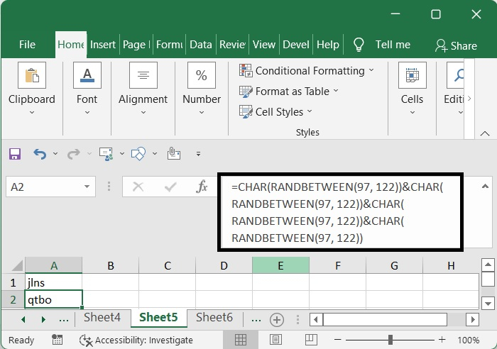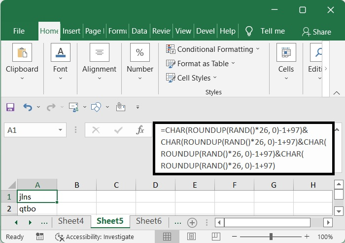 =CHAR(ROUNDUP(RAND()*26, 0)-1+97)&CHAR(ROUNDUP(RAND()*26, 0)-1+97)&CHAR(ROUNDUP(RAND()*26, 0)-1+97)&CHAR(ROUNDUP(RAND()*26, 0)-1+97)