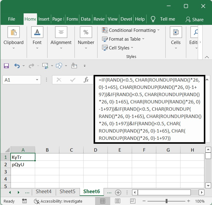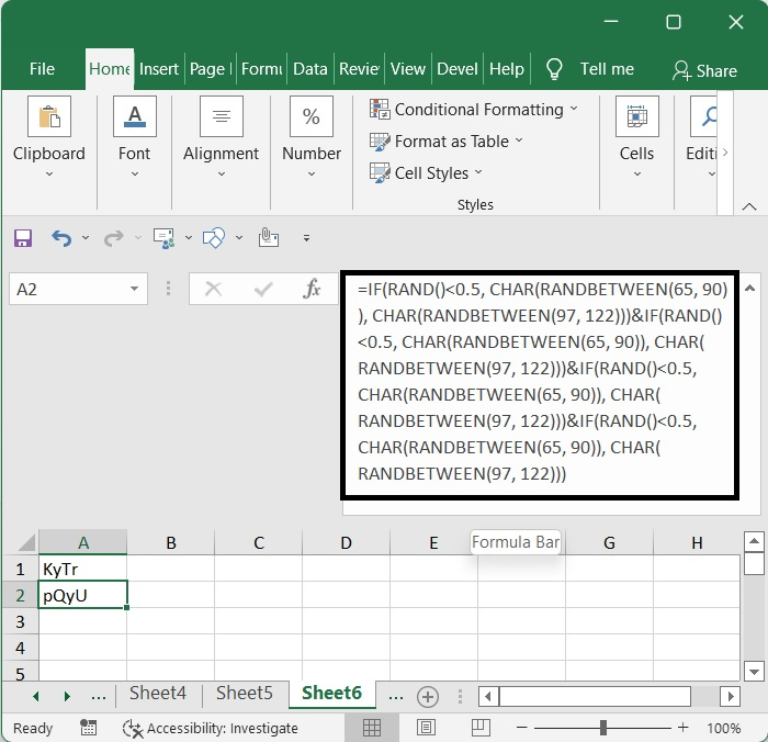 =IF(RAND()<0.5, CHAR(RANDBETWEEN(65, 90)),CHAR(RANDBETWEEN(97, 122)))&IF(RAND()<0.5,CHAR(RANDBETWEEN(65, 90)), CHAR(RANDBETWEEN(97,122)))&IF(RAND()<0.5, CHAR(RANDBETWEEN(65, 90)),8CHAR(RANDBETWEEN(97, 122)))&IF(RAND()<0.5,CHAR(RANDBETWEEN(65, 90)), CHAR(RANDBETWEEN(97, 122)))