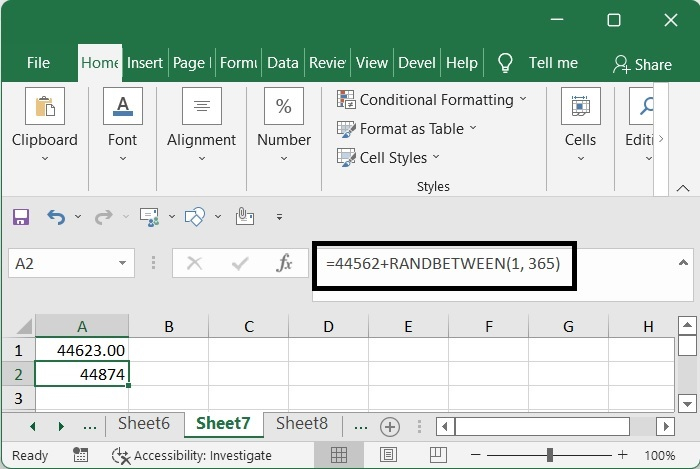 現在我們瞭解了 Excel 如何處理日期,假設您想生成 2022 年 1 月 1 日到 2023 年 1 月 1 日之間的隨機數。2022 年 1 月 1 日是 44562,2023 年 1 月 1 日是 44927。44927- 44562 = 365 天。
