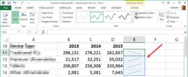 它們提供了一種非常簡單的方法來幫助視覺化資料隨時間的趨勢,尤其是在這些趨勢從原始數字中並不立即顯而易見時。要插入迷你圖 -